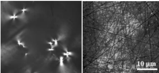 经过KOH腐蚀后的SiC衬底片、外延片微管,基平面位错,螺位错,刃位错等